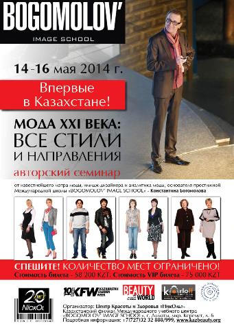 14-16 мая в Центре Красоты и Здоровья «NickOl» пройдет сенсационное событие 2014 года: Константин Богомолов, доктор наук, известнейший имидж-дизайнер и аналитик моды, автор многочисленных работ по теории и практике имидж-дизайна, руководитель Международного учебного центра «Bogomolov’ Image School» (Латвия), впервые проведет свой семинар для жителей и гостей южной столицы. Богомолов также откроет двери первого в Казахстане филиала своей престижной школы для профессионалов и увлеченных ценителей моды.