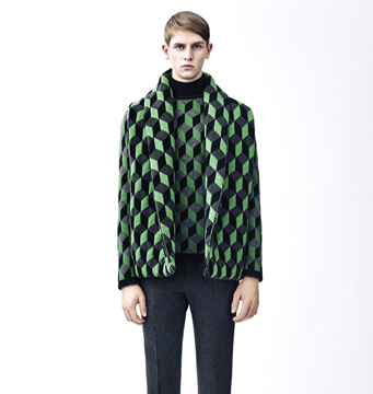 Брюки в коллекции выполнены из жаккарда с мелким «алмазным» рисунком, кашмировые изделия украшают пирамидальные формы и блоки, а хлопок выглядит так, словно покрыт частицами стекла или мозаики.