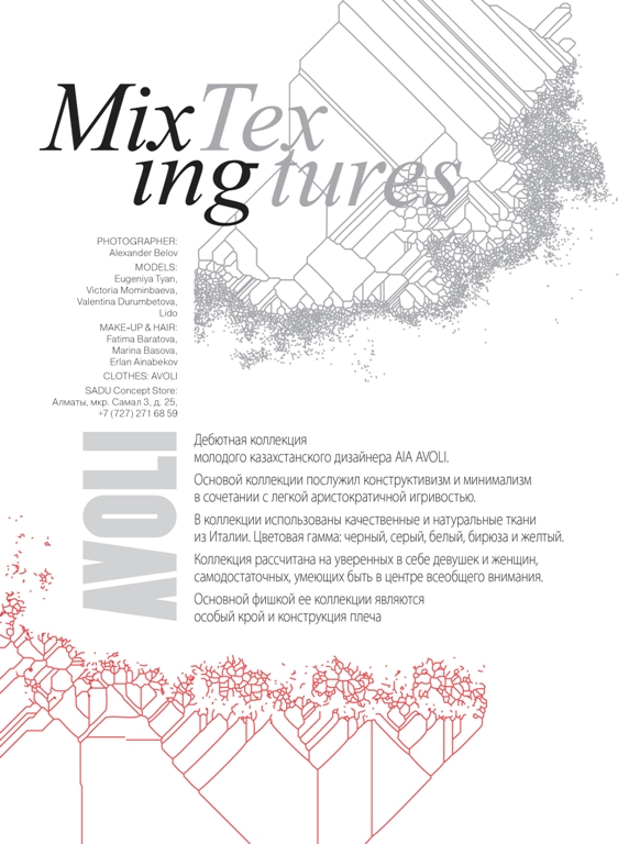 Для олицетворения нарядов из своей дебютной коллекции Айя пригласила для участия в фотосессии модного журнала «Винтаж» алматинских трендсеттеров, среди которых Виктория Моминбаева, Евгения Тян, Валентина Дурумбетова и Лидо.