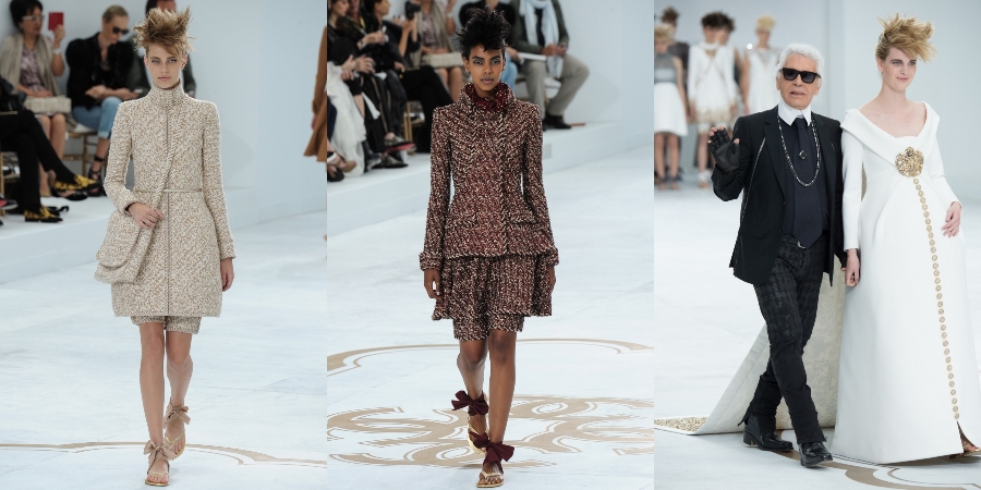 А вот модный дом Chanel не представил ничего экстраординарного и экстравагантного в рамках кутюрной коллекции осень-зима 2014/2015. Все тот же классический крой Chanel, все из того же любимого материала Карла Лагерфельда. Завершил показ сам мэтр под ручку с моделью.