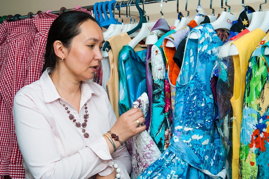 «Я буквально окружена теми вещами, которые мы создаем. Вот здесь можно увидеть наряды из коллекции, которая была показана на Казахстанской неделе моды, а немного дальше висят заказы для крупных клиентов, которые мы сделали, а теперь взяли на реставрацию».