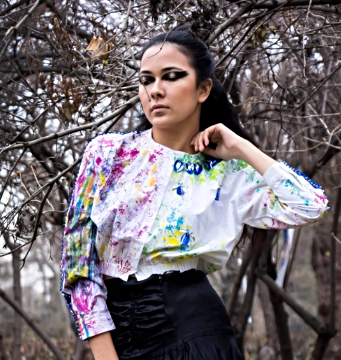 Вторая по счету сезонная коллекция дизайнера Тохтара Сейлбекова нашла отражение в интересной фотосессии на природе. Особенностью коллекции являются яркие элементы в виде цветных брызг и геометрических фигур на рубашках и футболках. На фоне сизых ветвей деревьев, выбранном для фотосессии, такой принт мгновенно бросается в глаза и выгодно контрастирует с другими элементами коллекции в черно-белых тонах.