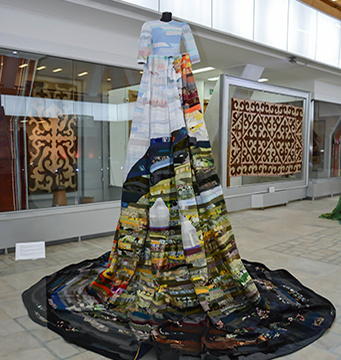 На создание платья автора вдохновлиа тема Казахстана, как страны с богатым историческим прошлым и разнообразием полезных ископаемых. Экспонат состоит из накидки, декорированной деталями из полиэтилена, юбки, отделанной зигзагообразными деталями, а также из нагрудного украшения из пластика, стилизованное под казахское национальное украшение.